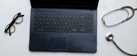 Medical stethoscope and laptop computer ,glasses onOn the doctor's desk. Online medical, e-health education, Medical business report on global network.
