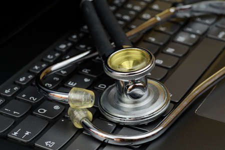 Stethoscope on laptop keyboard. Health care or IT security concept.