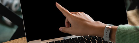 partial view of african american woman pointing with finger at laptop with blank screen, banner