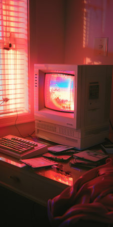A lone CRT monitor glimmers in the darkness its screen displaying a nostalgic menu screen while a vivid violet glow bathes the surrounding space in a surreal light..