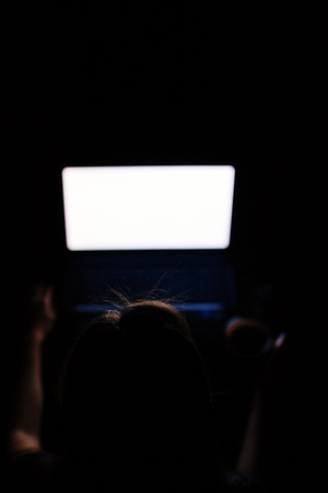A white screen blank space on Pc monitor in internet cafe. Young asian gamer in red neon light.