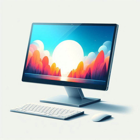 computer monitor with colorful screen and keyboard on white background. 3d illustration