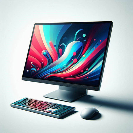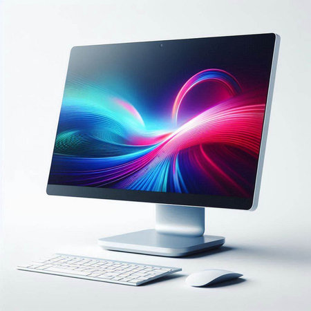 Computer monitor with colorful abstract screen and keyboard on white background. 3d illustration