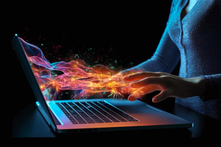 Virtual energy passes from the laptop screen to the user hands, generative AI