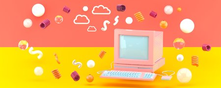 The computer floats amidst a ball on an orange and pink backdrop.-3d render.