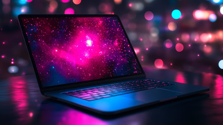 Neon Glow Open Laptop With Galaxy Wallpaper, Reflecting Vibrant Pink And Blue Lights