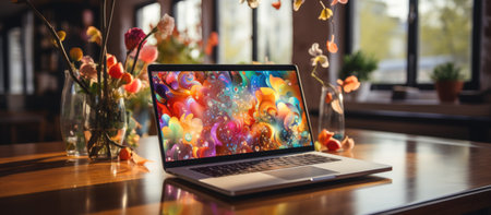 A laptop sits atop a table, its screen displaying a bright and abstract screensaver, adding a modern touch to any workspace.