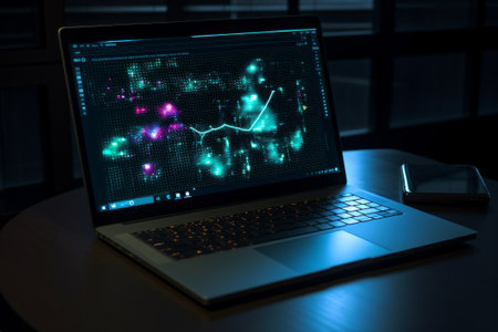 Close up of a laptop with colorful lights on the screen. technology concept. Generative AI.