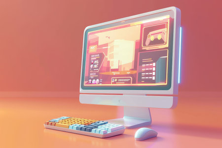 Computer Monitor and Keyboard Depicting a computer monitor displaying a video game interface