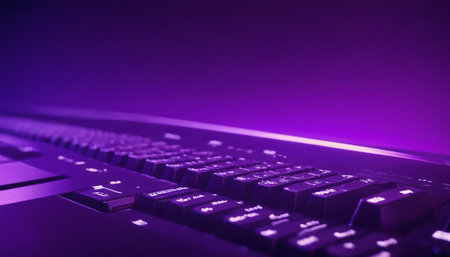 A close-up view presents a laptop screen displaying lines of code. The screen emanates a vibrant purple light, illuminating the keyboard. The image features a shallow depth of field, with soft focus on the background suggesting an indoor environment. Ideal for editorial use and illustrating technology-related topics.