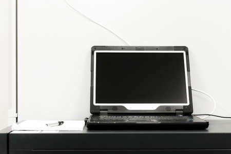 black notebook with opened display in front of server rack