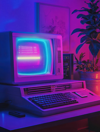 Vintage computer workstation in neon glow