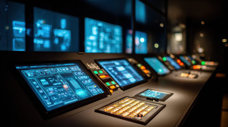Control screens illuminate with bright colors in a dark room presenting data relevant to lighting systems at night.