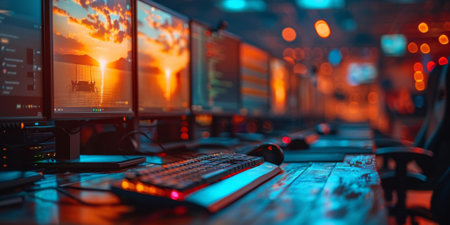 Top-end system unit for gaming computer close up. Inside of illuminated cybercafe, no people. Modern tech, fun, esport, online video games internet cafe. Panoramic cropped view, horizontal photo
