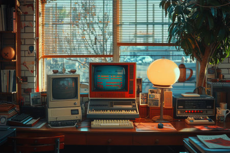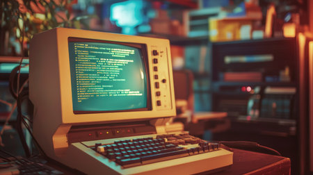 This captivating image features a vintage computer workstation set in a nostalgic environment, showcasing a glowing green screen filled with code. The retro aesthetic invites a sense of history while reflecting on the evolution of technology.