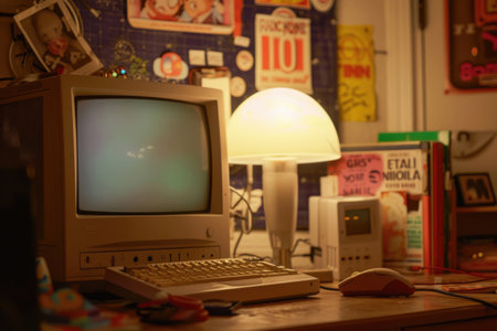 A vintage computer setup with '90s memorabilia