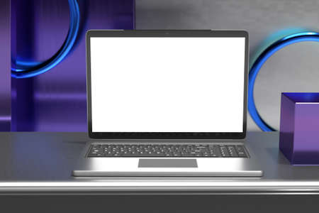 Modern opened laptop computer on creative designer metallic shiny cube with reflections of neon rays on notebook surface with blank mock up screen, copy space for text