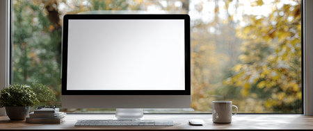 A desktop computer sits on a desk with a blank screen, near a window overlooking a blurred natural environment. The composition includes a coffee cup, plant and books, set against the neutral colors of the workspace. This image is suitable for various commercial uses.