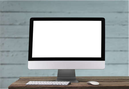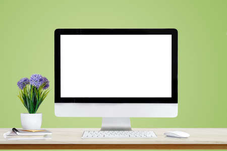 workspace with computer with blank white screen, and office supplies on a wooden desk