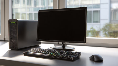 A sleek, black desktop computer setup, including a monitor, keyboard and mouse, sits on a light gray desk by the window in a modern office setting.