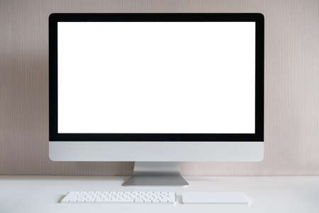 Isolated with clipping path, Modern All in One Desktop computer with wireless keyboard and touchpad on the white table, decorated in minimalist style with copyspace. Modern workspace concept.