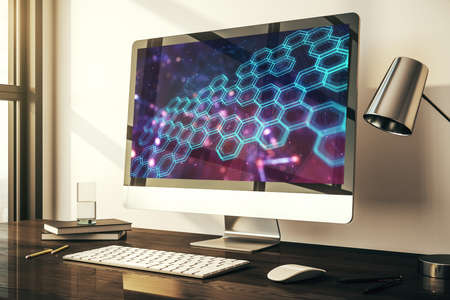 Creative concept of wireless technology with hexagon hologram on modern laptop screen. Big data and database concept. 3D Rendering