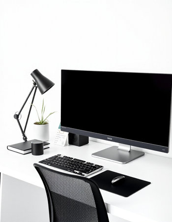 Modern workspace with computer monitor, keyboard, mouse, stationery and other items