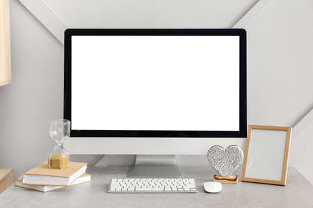 Workplace with modern computer, books, hourglass and blank photo frame near light wall
