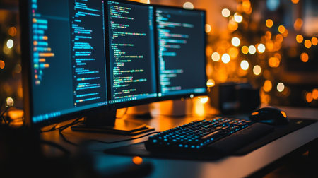 Workplace at the computer at night. Home workplace with a beautiful computer with blue light and a red screen on the monitor. Gaming computer at night. Background Copy space
