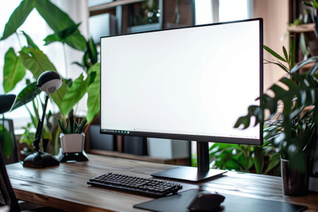 Blank screen of All in one Computer with Monstera and smartphone on table
