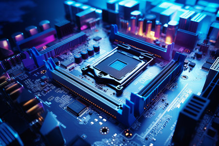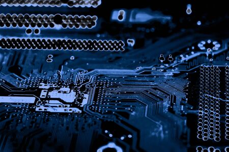 Dark blue computer motherboard closeup in tilt shift style. Selective focus, defocused