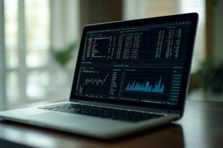 A modern workstation with a laptop showing financial indicators sits beside papers and a coffee cup.