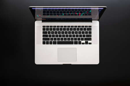 Laptop screen with stock market charts. Technical analysis and fundamental indicators of stock quotes in the trading terminal. Japanese candlesticks and company tickers.