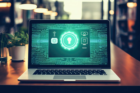 Laptop displaying cloud security interface on screen with green plant background, AI generated