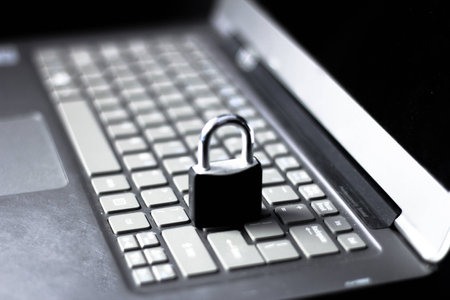 Padlock on a laptop computer keyboard. Cyber security abstract concept. Copy space on the left.