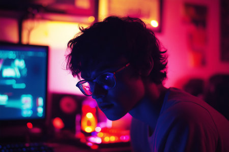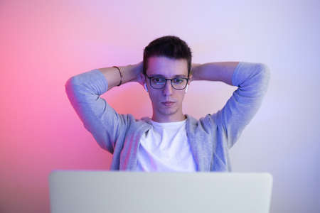 Young man with glasses playing video games or working on computer in a room illuminated by neon lights