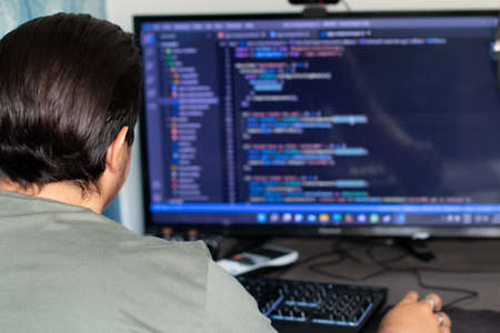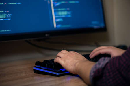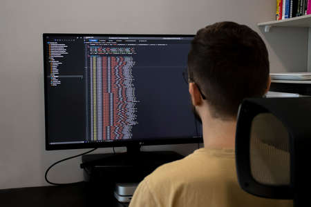 Man freelancer is working at home. Programmer is coding. Programming screen.