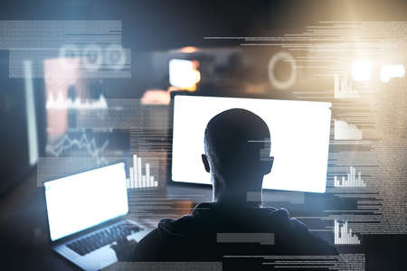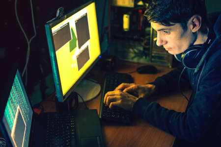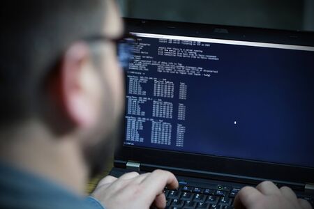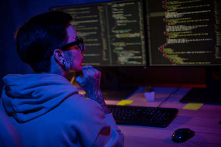 Hacker in glasses breaking code. Criminal hacker penetrating network system from his dark hacker room. Computer program writer at work. Rear view.