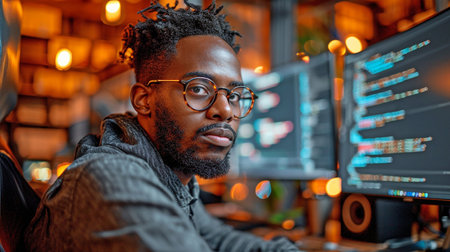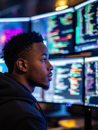Silhouette of a young African American man deeply focused on coding or programming on multiple computer screens in a dark neon lit office or technology workspace setting Concept of technology