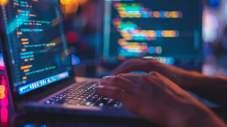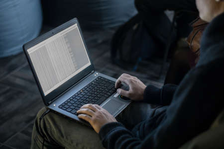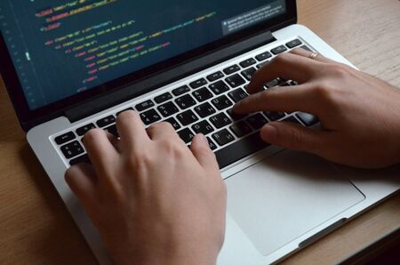 Computer code, software concept. Programmer working with a laptop, programming code on the screen, office background. Developing coding technologies.