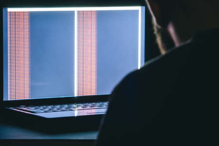 Rear view of computer hacker sitting and reading a computer code reflecting on his back