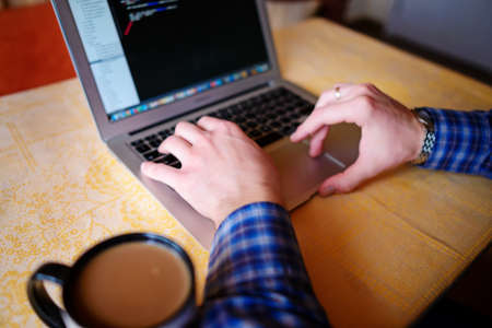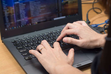 Programmer coding on laptop computer. Coder hand closeup writing program code on keyboard for project. Professional developer programming, freelance working concept