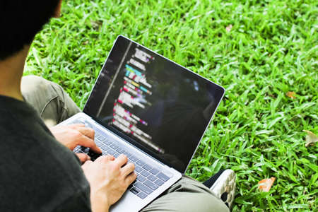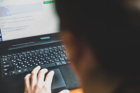 Selective focus Developer programming and coding technology on computer laptop Website design Safety of the social world Cyberspace concept.outdoor