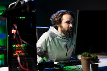 Man plays intense videogame tournament online during stream with fans, spamming attack buttons. Player participating in esports competition during livestream, pressing hard on keyboard keys