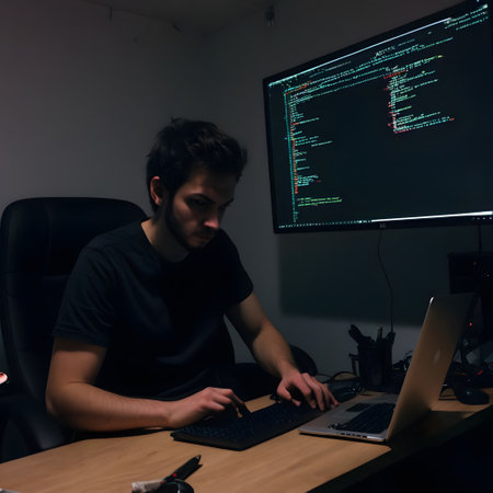 Developer intensively debugging complex code on a dark-themed integrated development environment in a dimly lit workspace, showing high focus and concentration.