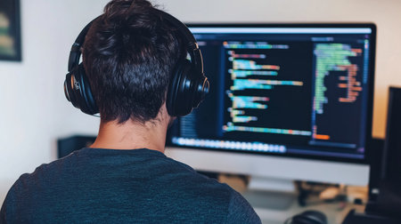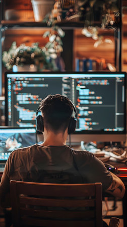 A programmer working intensely at their computer desk, coding software with headphones on in a cozy indoor workspace