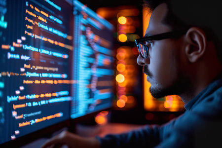 A focused young man observes colorful code on a dark monitor, embodying the essence of coding, technology, and creativity in a modern workspace