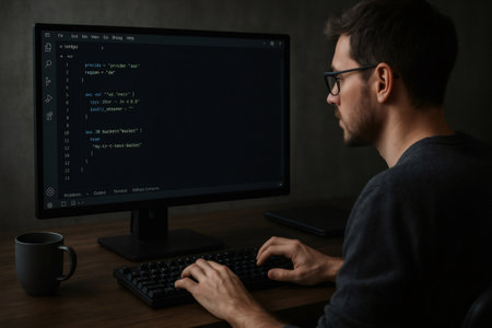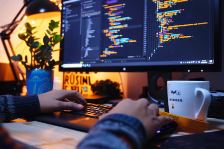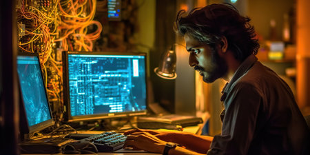 Computer programmer immersed in coding cloud applications within a dimly lit home office environment, focusing on software development tasks
