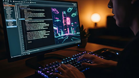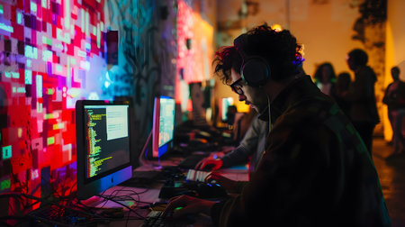 This image depicts a hacker or software developer working diligently at a computer in a vibrant,technologically-advanced urban setting The workspace is illuminated by colorful neon lights,creating a