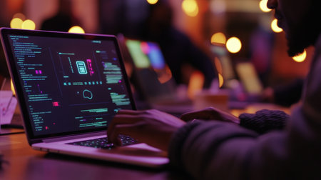 A close-up shot captures a laptop screen illuminated with lines of code. The display is the focal point, reflecting a purplish hue against a dark background. The scene suggests an indoor environment, possibly at night. Suitable for commercial projects or editorial content relating to coding or software development.